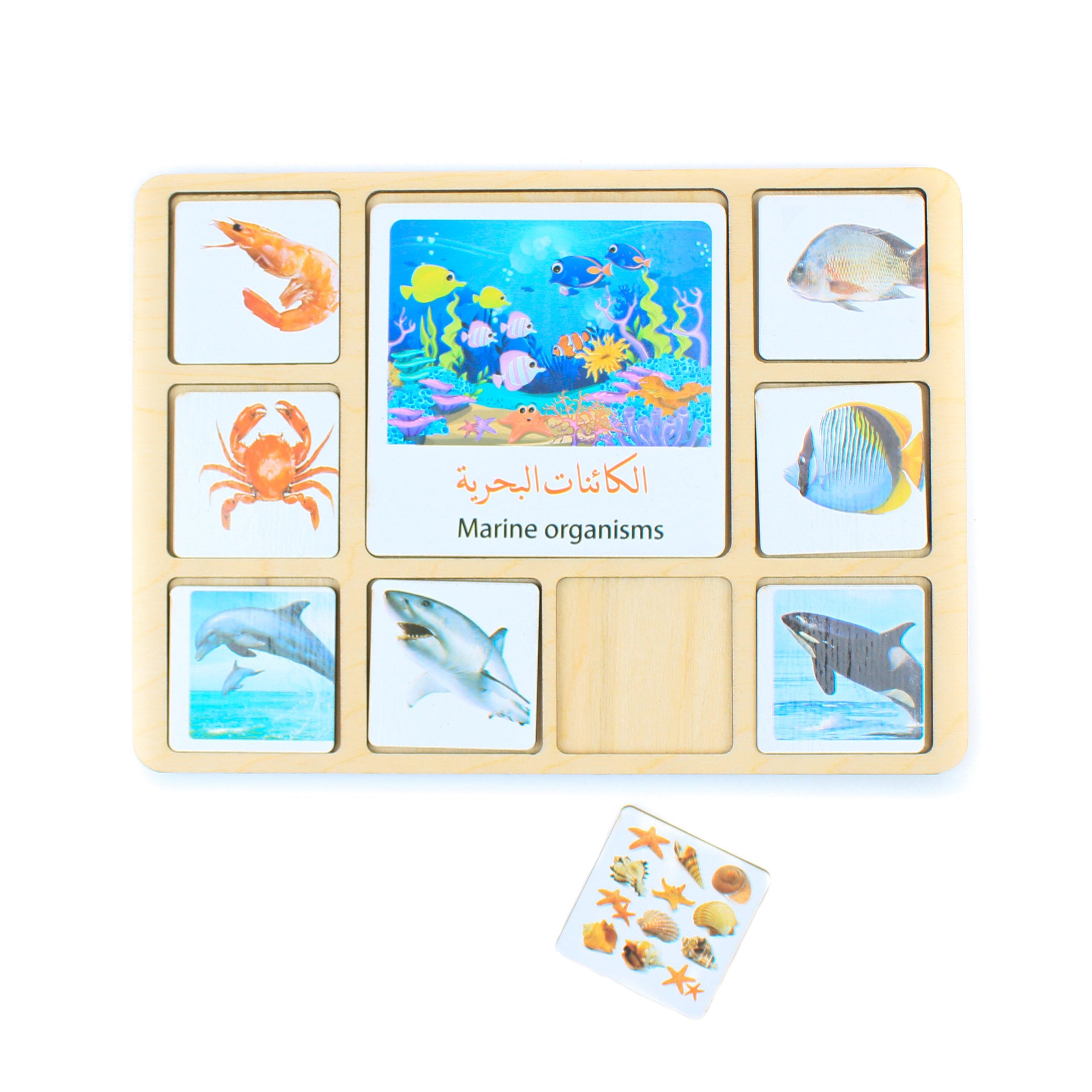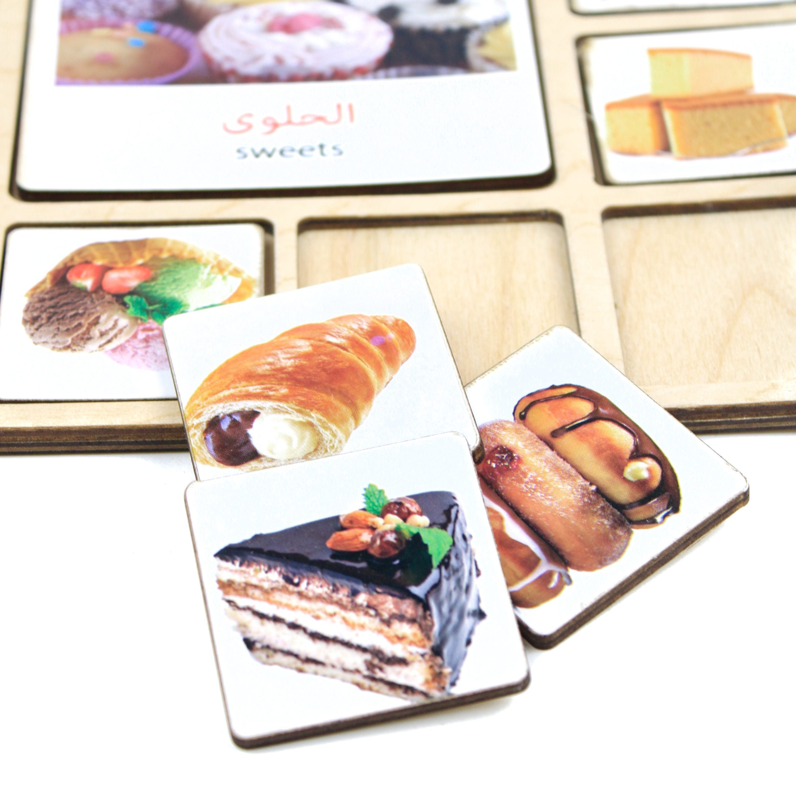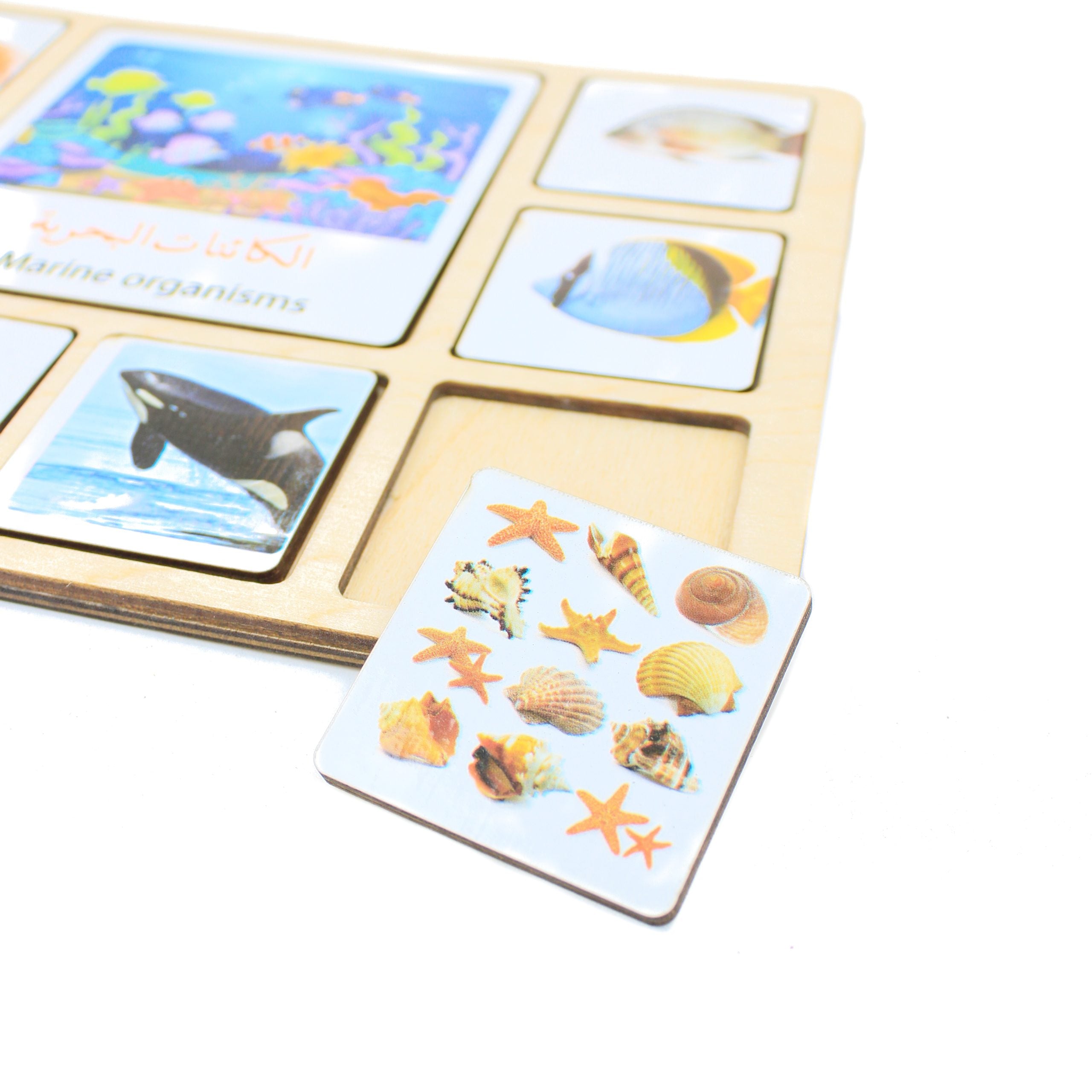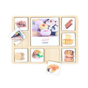 - 18 بطاقة خشبية حجم كبير . وكل بطاقة معاها 8 بطاقات صغيرة للتصنيف