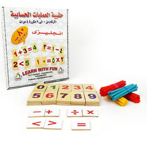 - حقيبة العمليات الحسابية تتكون من الارقام 0 الى 9 مكررة 4 مرات بالاضافة لعصيان العد الملونة