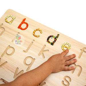 يمكن للطفل استخدام الحبوب، الخرز، أو الصلصال لملء الحروف داخل اللوحة، مما يعزز الفهم العميق لشكل الحرف بطريقة ملموسة.
