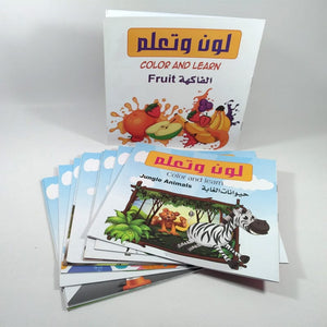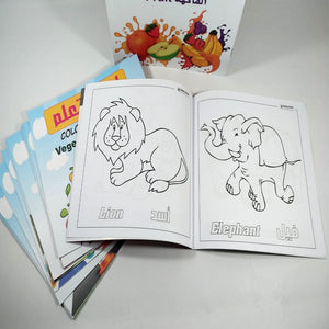• كل كتاب يحتوى على 12 رسمة و اسم الحيوان او الشئ باللغتين العربية و الانجليزية