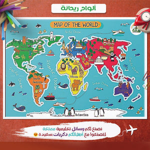 خريطة العالم فيل-ريحانة المرسومة بالحيوانات تساعد طفلك علي التعرف علي قارات ومحيطات العالم بطريقة بسيطة