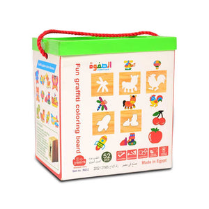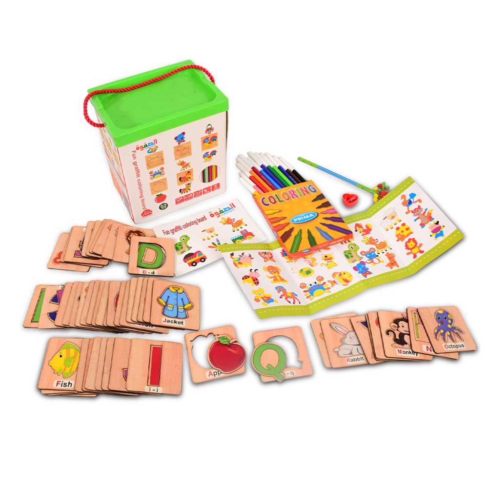 صندوق الرسم يتكون من 52 قطعة خشبية مفرغة 26 قطعة للحروف الانجليزية , 28 قطعة لأشكال مختلفة للاستدلال على الحرف , قلم رصاص مع ممحاة , الوان , كراسة رسم و براية