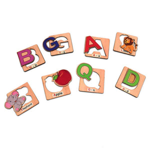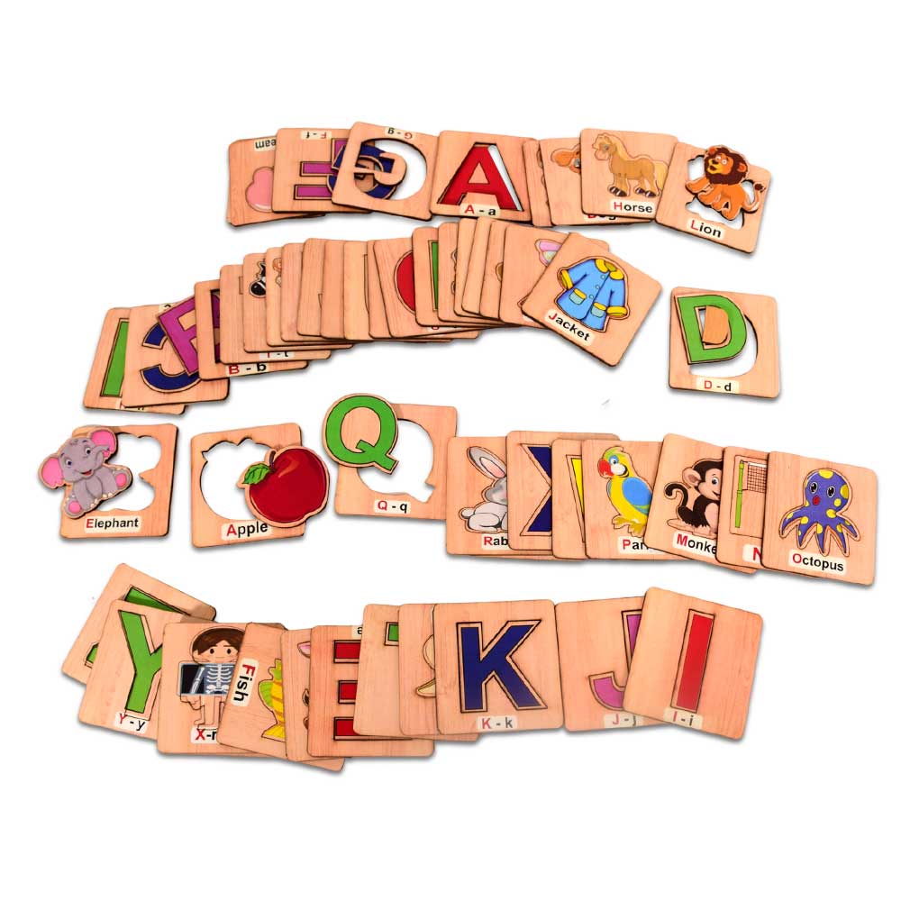 صندوق يحتوي على كل الحروف الانجليزية مفرغة كالبازل لتعلم الحروف بطريقة تفاعلية
