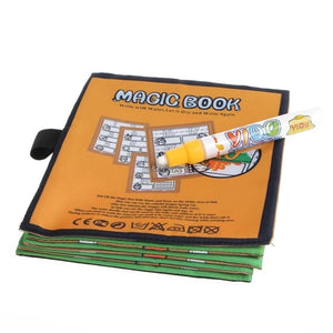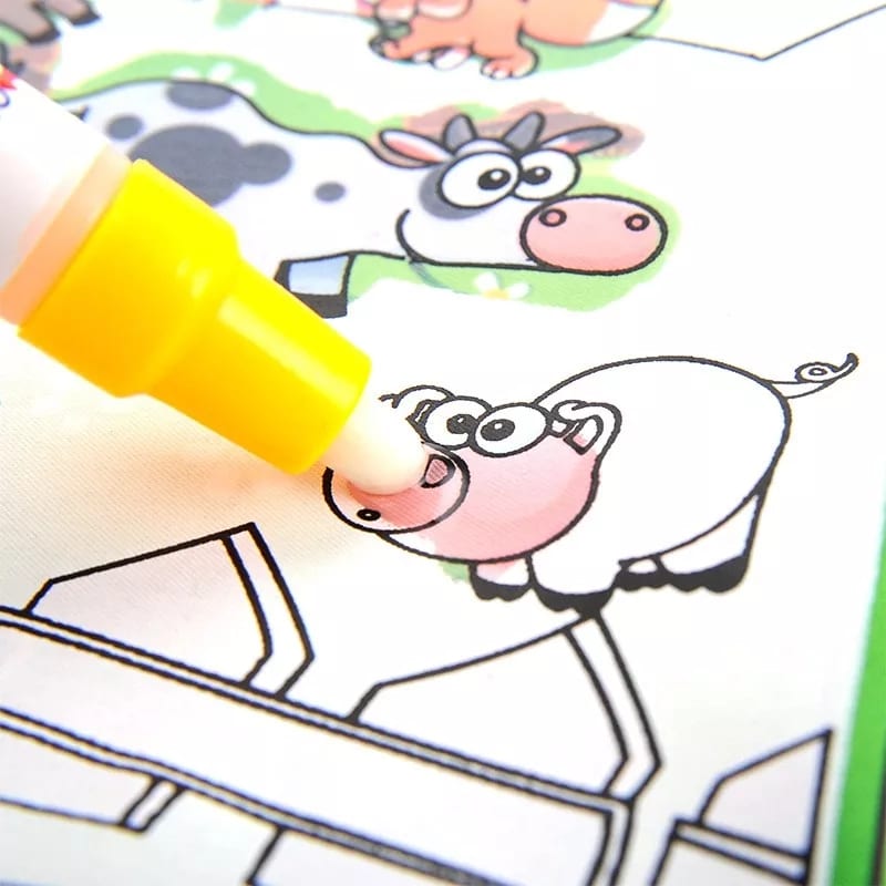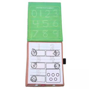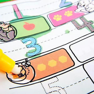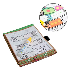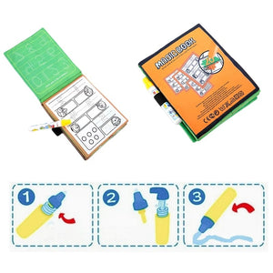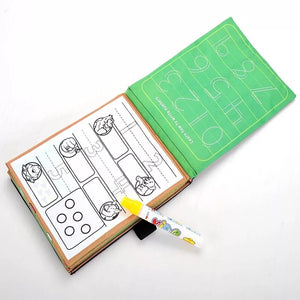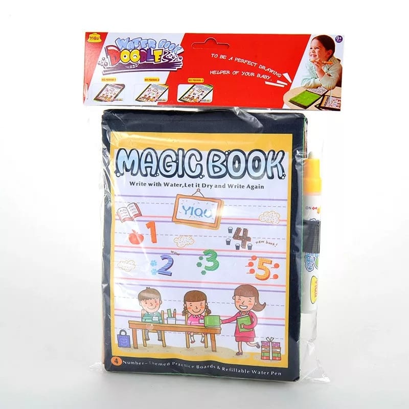 الكتاب عباره عن صفحات مصنوع من القماش ملون وموجود بداخله الارقام الانجلزيه مرسوم جزء منها لمساعده الطفل في تخيل الرقم و الجزء الاخر يقوم الطفل رسمه بالقلم السحري الذي تقوم الام بوضع الماء به و عندما يجف الماء الذي قام الطفل الرسم بيه يعود الكتاب فارغ من الرسومات كما كان فيمكن لطفلك استخدامه العديد و العديد من المرات