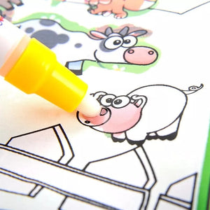 يقوم الطفل بملئ القلم بالماء ثم الكتابة والتلوين داخل الكتاب القماش