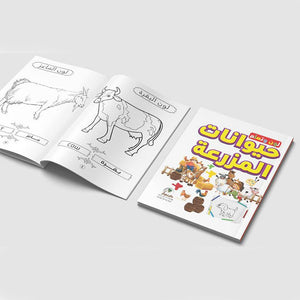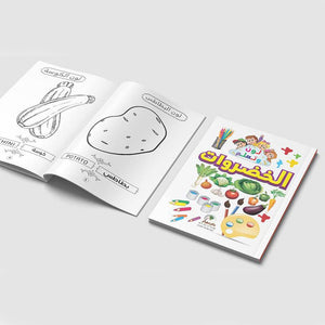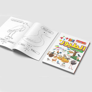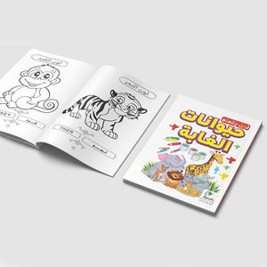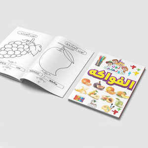 تحتوي كل صفحة من صفحات (حيوانات الغابة – الطيور – الفواكة – الخضراوات- حيوانات المزرعة ) علي شكل رسمة ومكتوب اسمها باللغة العربية والانجليزيه يقوم الطفل بتلوينه بالالوان المناسبة