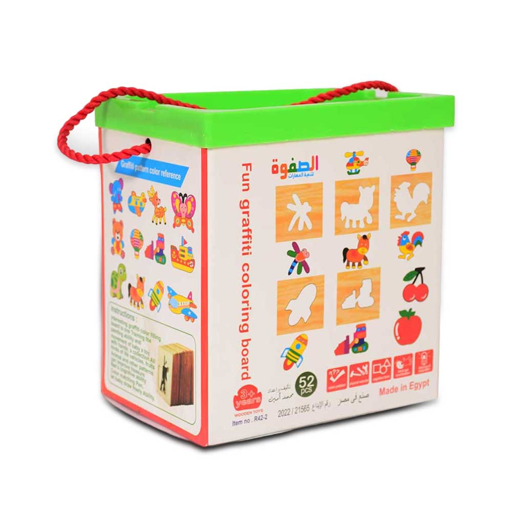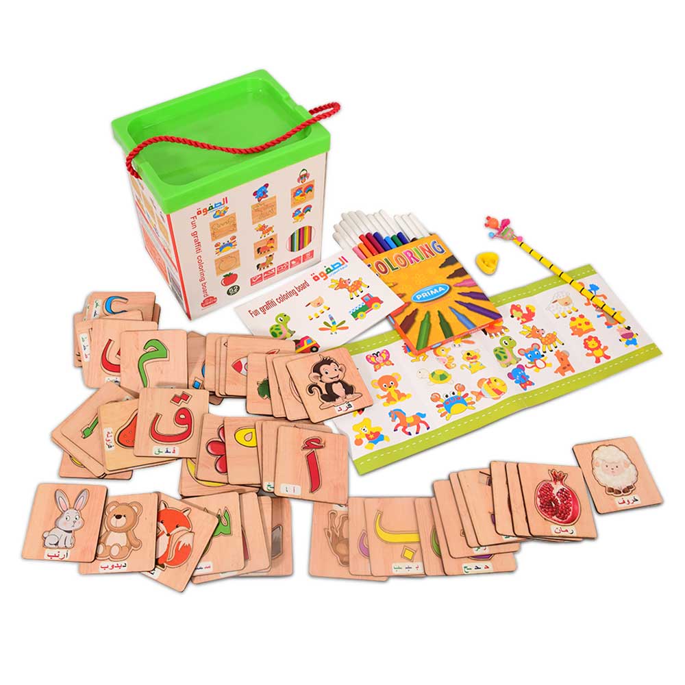 صندوق الرسم يتكون من 56 قطعة خشبية مفرغة 28 قطعة للحروف اللغة العربية , 28 قطعة لأشكال مختلفة للاستدلال على الحرف , قلم رصاص مع ممحاة , الوان , كراسة رسم و براية