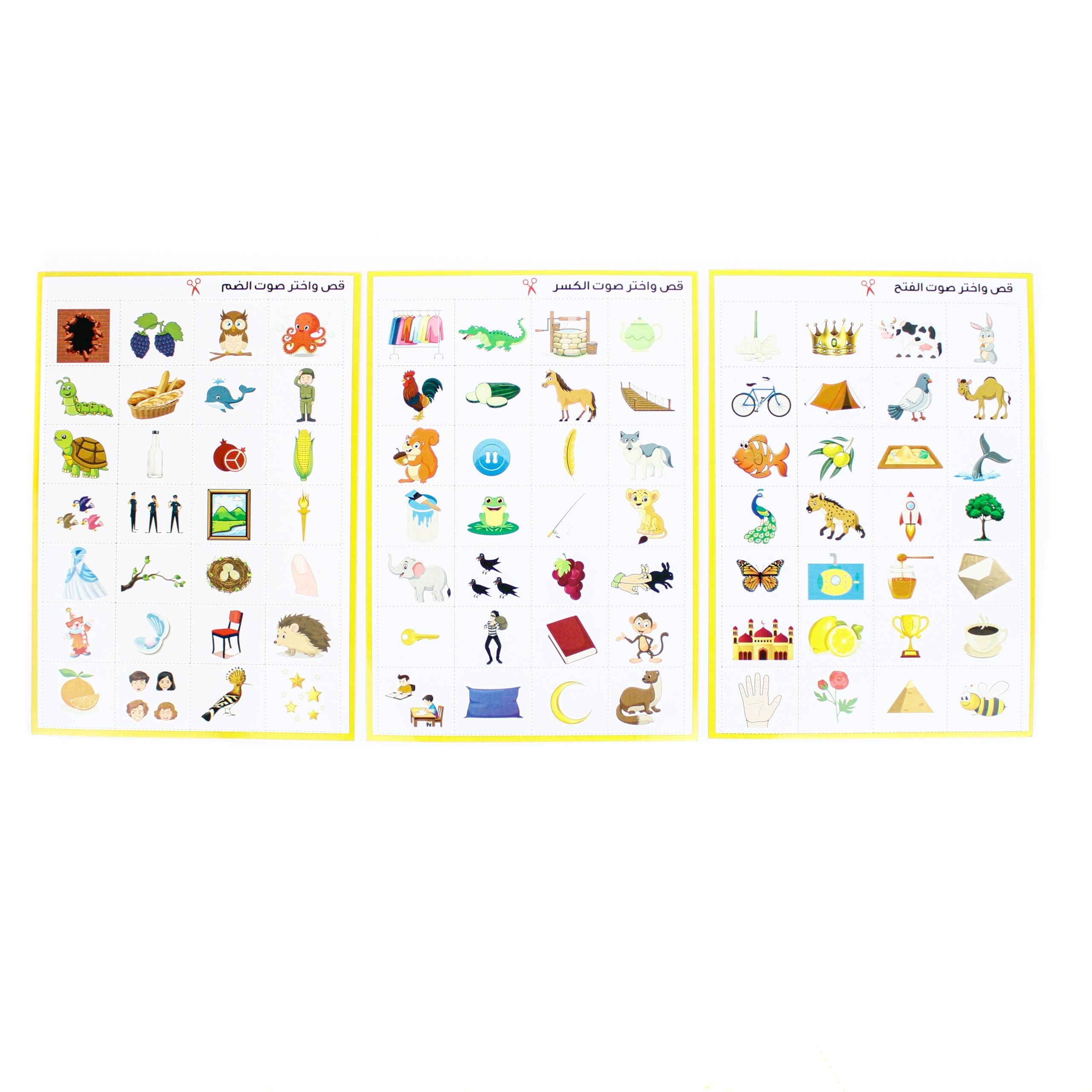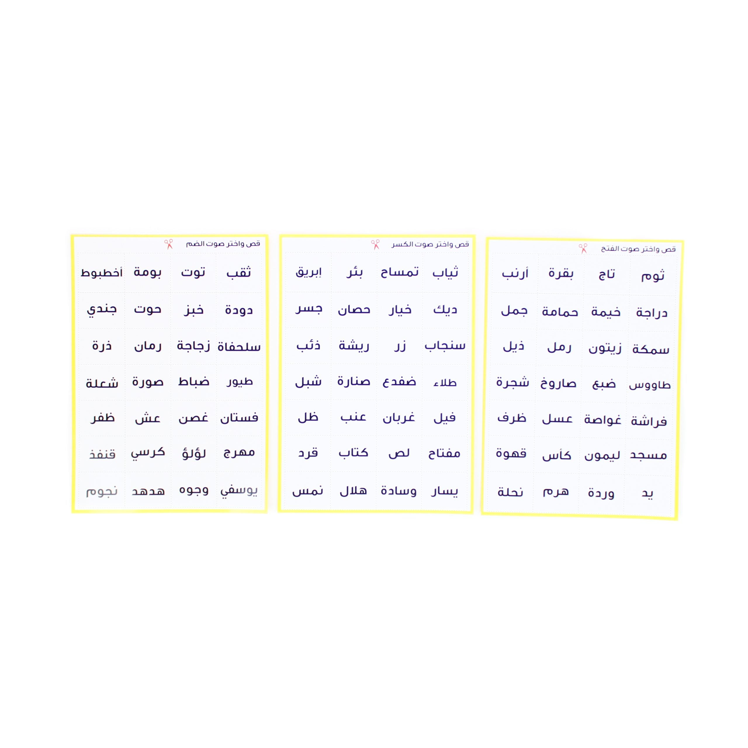 - التمييز السمعي والبصري : من خلال 3 مجموعات لانشطة تدرب الطفل على (الفتحة والكسرة والضمة) من خلال صور يتعرف الطفل على اسمائها ليميز التشكيل ويحسن من التمييز السمعي والبصري .
