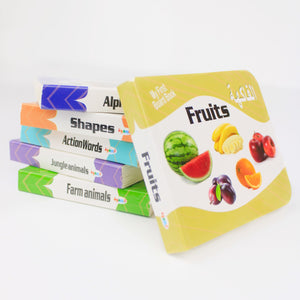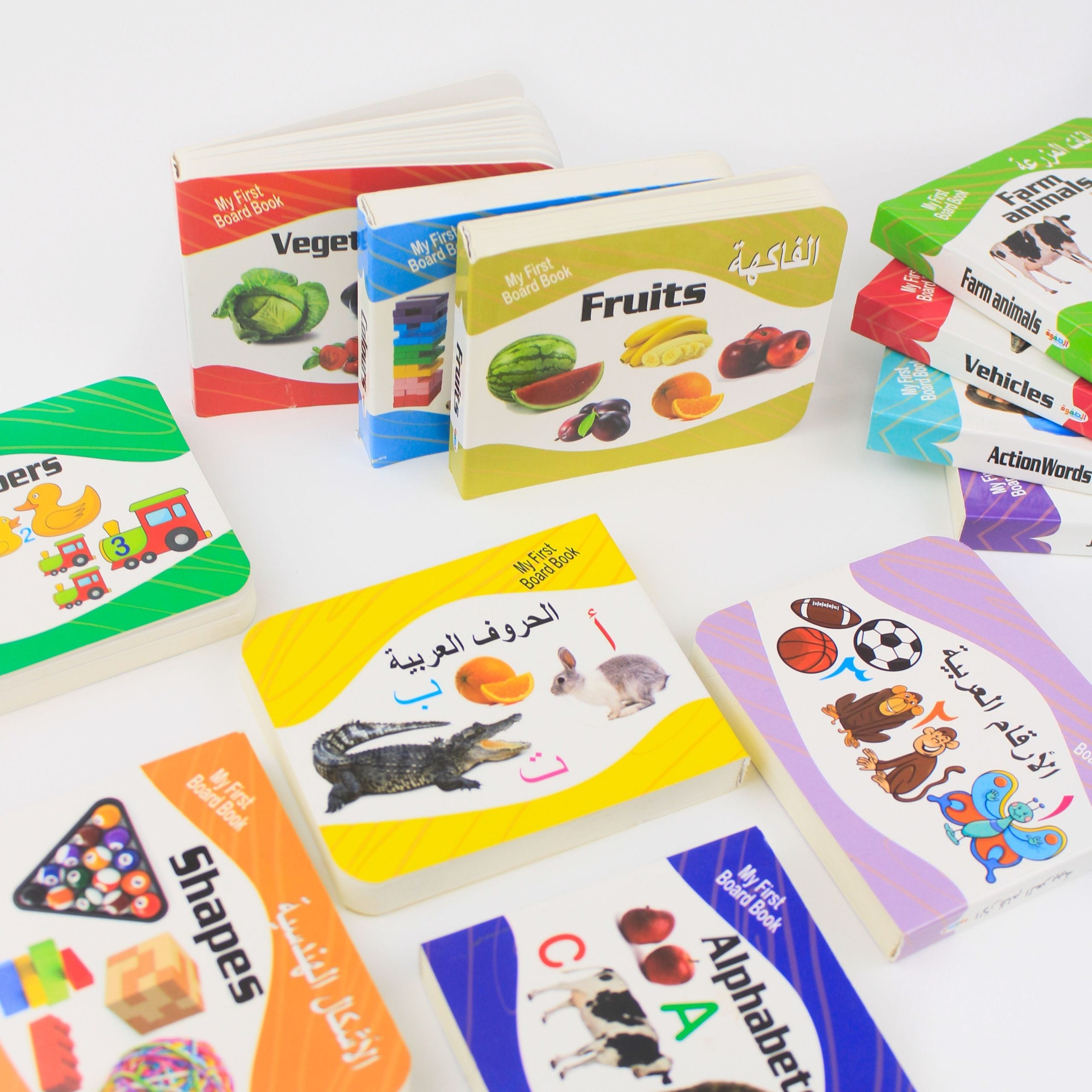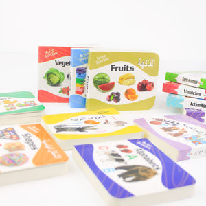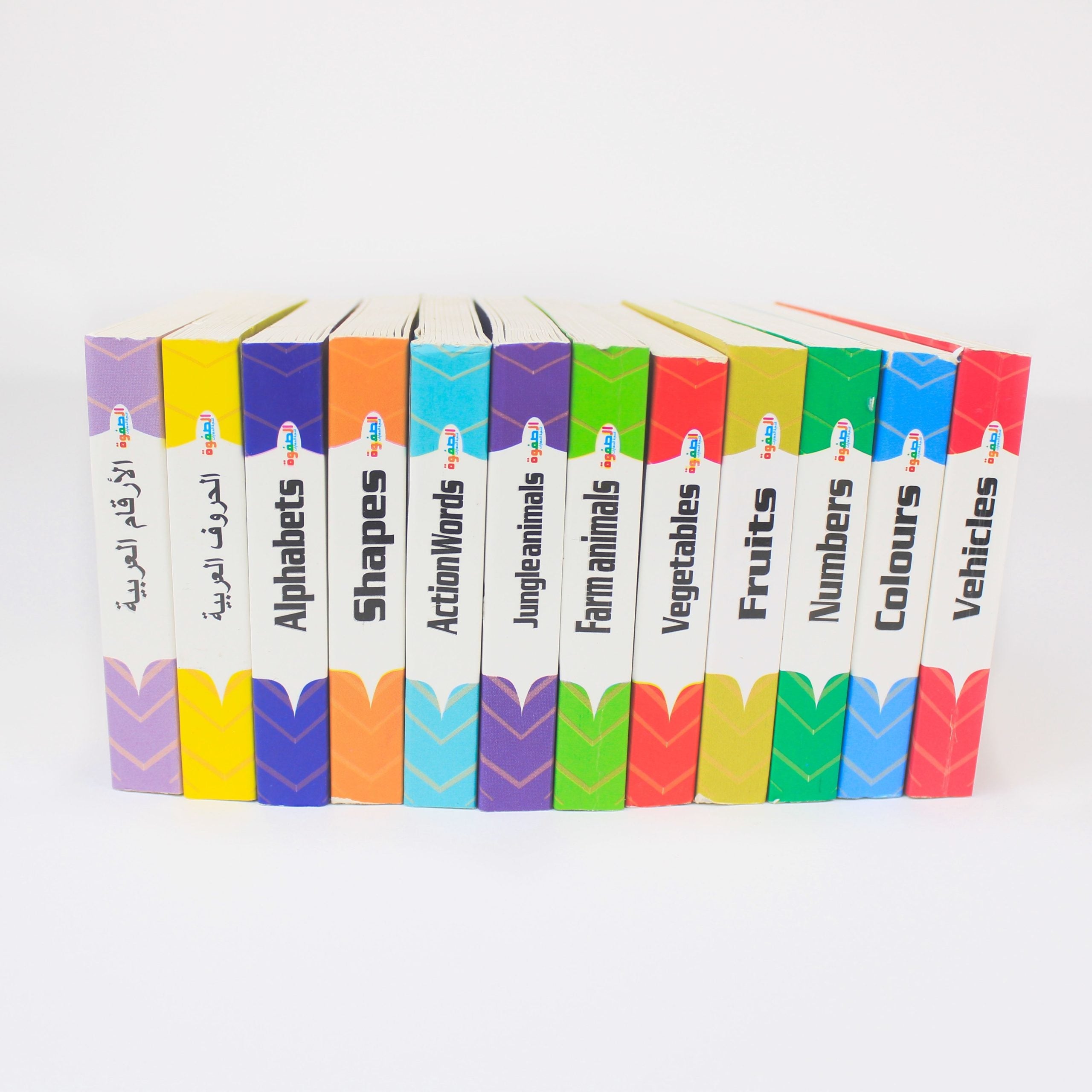 - عدد مواضيع الكتب : 12 ( فاكهة ، خضروات ،حيوانات غابة ، حيوانات مزرعة ، وسائل مواصلات ، افعال ، حروف عربي ، حروف انجليزي ، ارقام عربي ، ارقام انجليزي ، اشكال هندسية ، الوان )