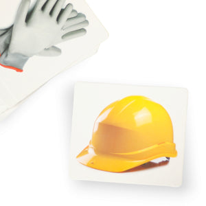 تحتوي كل بطاقة على صورة طبيعية لاداة من ادوات مهنة معينة مع تفاصيل توضيحية، مثل سماعة طبية او شنيور