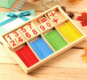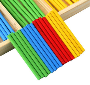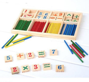 مجموعه من العصي الملون و مجموعة اخري من الارقام و العلامات الحسابية الموجودة علي شكل مربعات صغيرة بداخل صندوق من الخشب الأمن لاستخدام الطفل