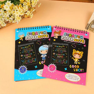 لكل أم ملاحظه لابنئها اذا كان طفلك يحب الرسم و اللوان فسكراتش نوت هو أفضل هدية له سكراتش نوت عبارة عن ورق اسود اللون مخبئة اسفله الوان قوس قوزح سكراتش نوت متعددة الاستخدامات يمكنك الرسم عليها باستخدام القلم الخشبى المصاحب لها او كتابة الملاحظات أيضا