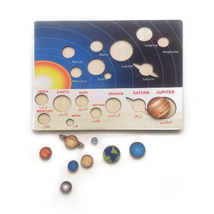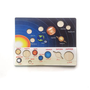 يحتوي هذا البازل على كواكب المجموعة الشمسية مع أسمائها باللغتين العربية والإنجليزية، مما يساعد الطفل على التعرف على الفضاء بطريقة ممتعة وتفاعلية.