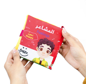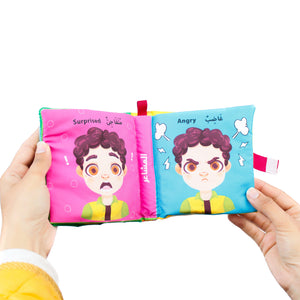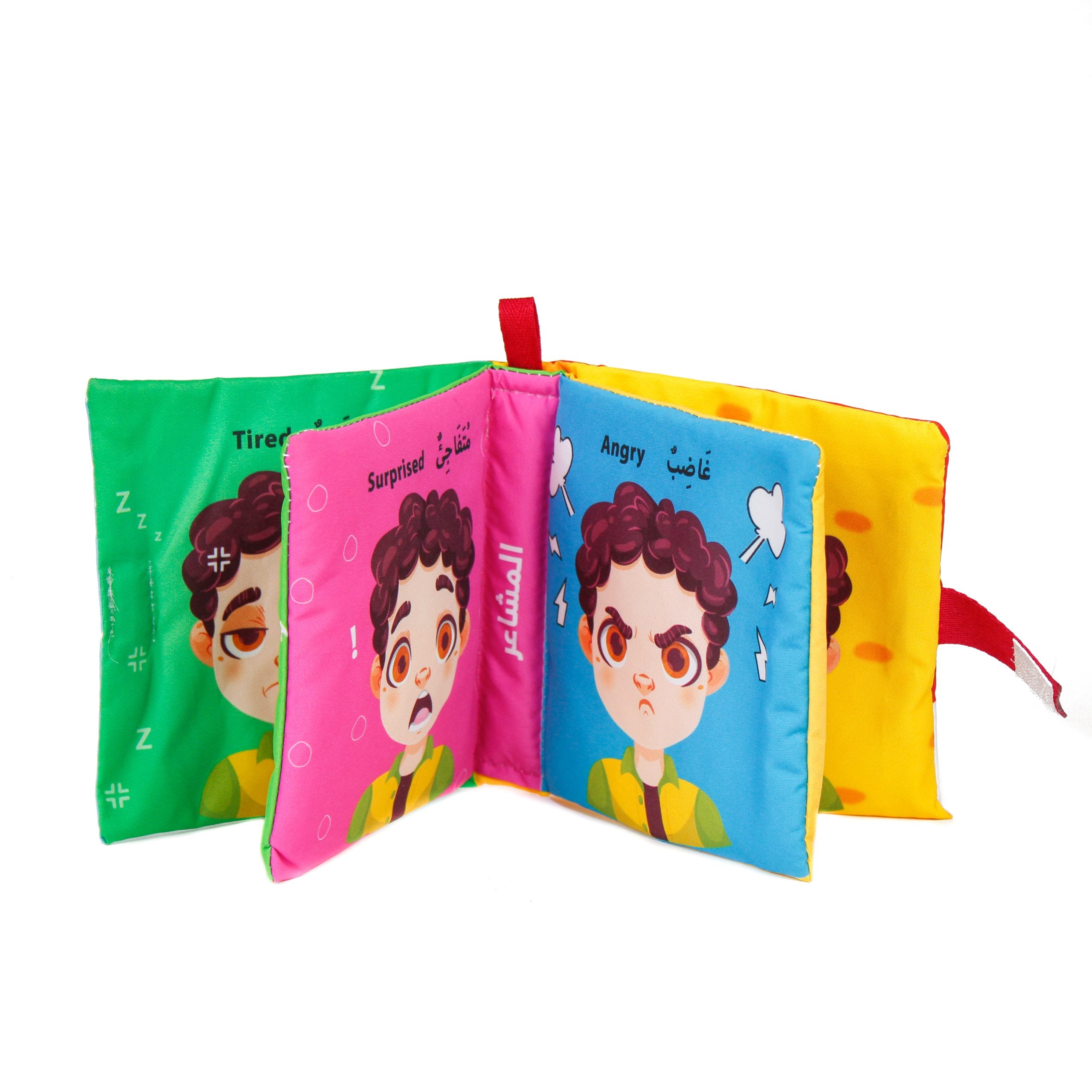 - تعلم اسماء المشاعر : يعرّف الكتاب الأطفال على أسماء المشاعر باللغتين العربية والانجليزية ليساعدهم على ربط المشاعر بالكلمات.