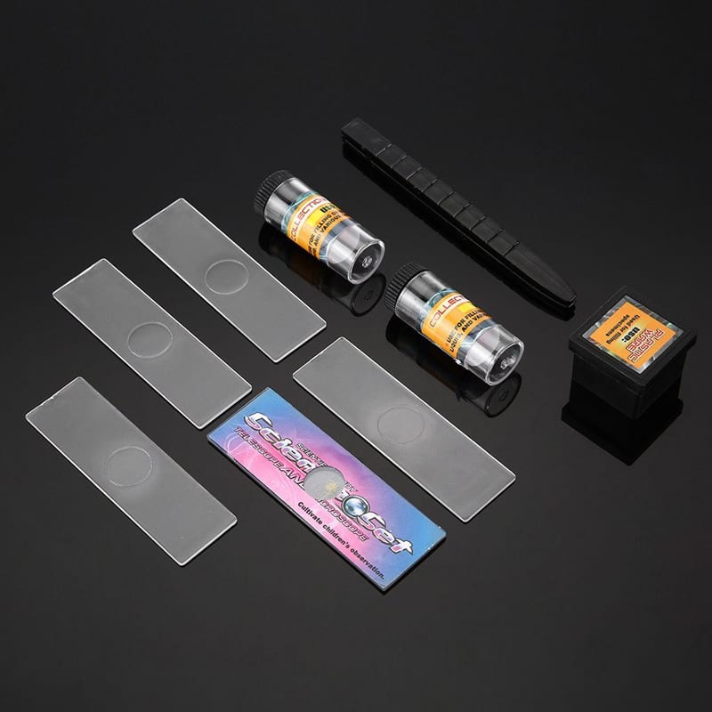 - يشتمل الميكرسكوب على ملقاط لجمع و تحريك العينات، زجاجتين لجمع العينات داخلها، شرائح زجاجية لمعاينة العينات بسهولة