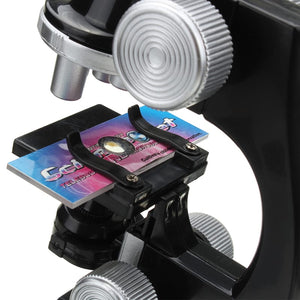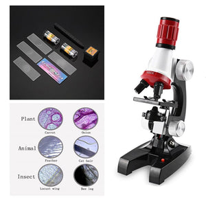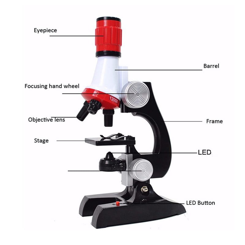 - المكيرسكوب يمتاز بقوة تكبير عالية تمنح الطفل رؤية واضحة للعينات بقوة تكبير تتراوح ما بين 100 X400X1200