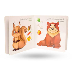 كتاب تفاعلي للاطفال بطريقة اكتب وامسح عبارة عن حيوان وبيسأل الطفل ما هو طعامي ومتاح 3 اختيارات للطفل