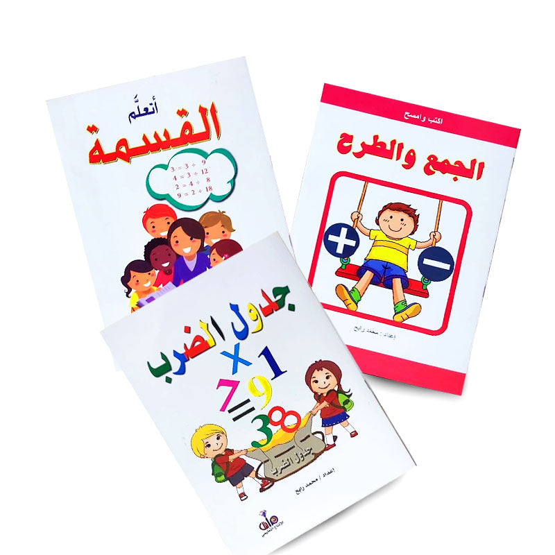 مجموعة اكتب وامسح: 3 كتب الجمع والطرح والقسمة وجدول الضرب