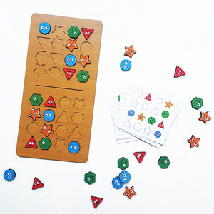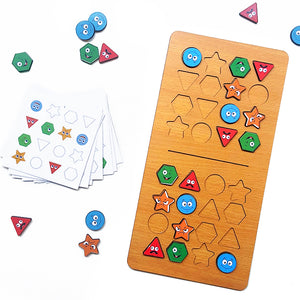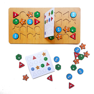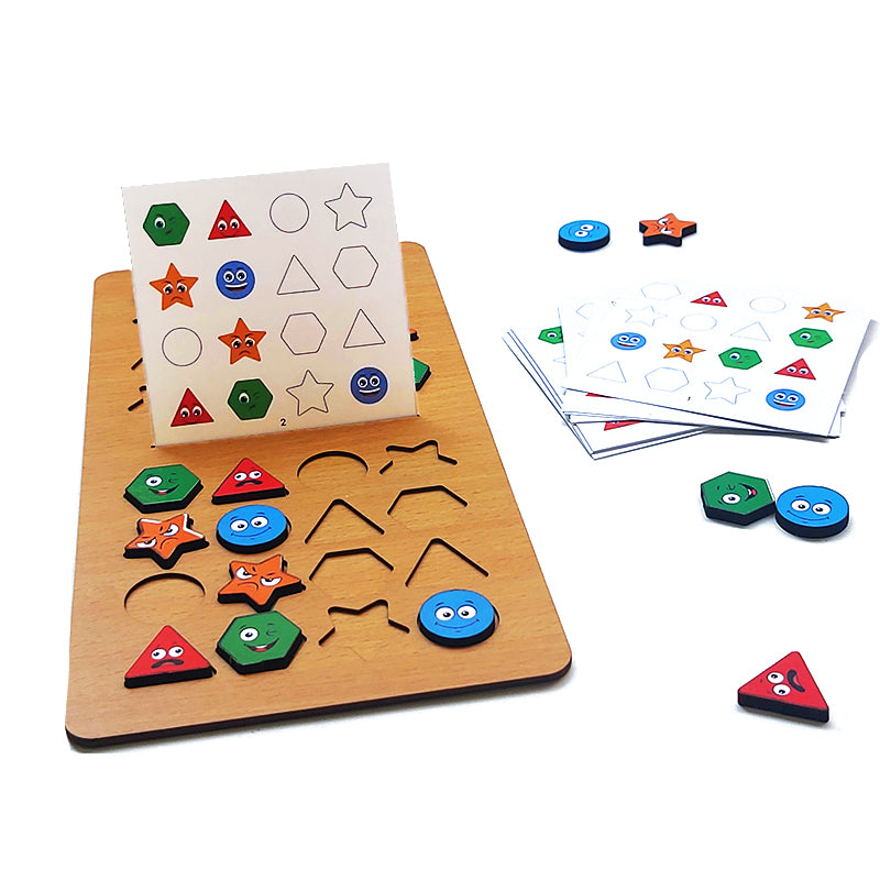 ابدؤوا المطابقة: يطابق الطفل كل قطعة خشبية مع الشكل والتعبير الموجود في مكانه الصحيح على لوحة الخشب.