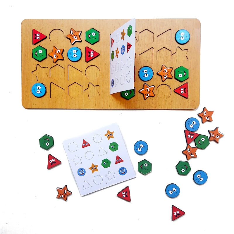 خلّي الطفل يلاحظ شكل كل قطعة هندسية (مثلث – دائرة – نجمة – سداسي...) وكمان تعبير الوجه الموجود على القطعة (فرحان – زعلان – متفاجئ...).