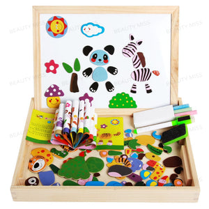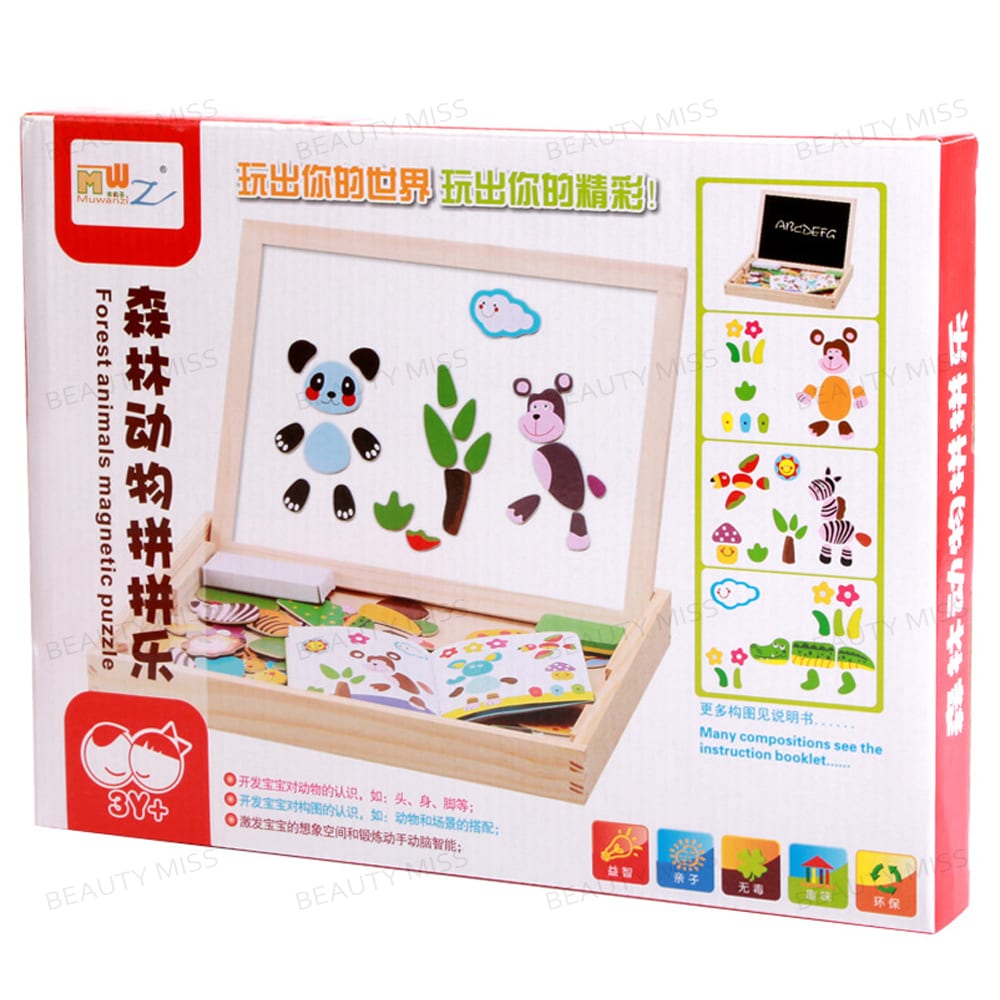لعبة السبورة المغناطيسية وهى عباره عن سبوره مغناطيسيه ذات وجهين ومجموعه من اشكال حيوانات الغابة التى تحتوى على مغناطيس يقوم الطفل بلصقها علي جانب من جوانب السبوره لصناعه لوحه فنيه و الوجه الاخر يتم بالكتابه عليه باستخدام القلم المصاحب للسبوره ومعه ممحاه