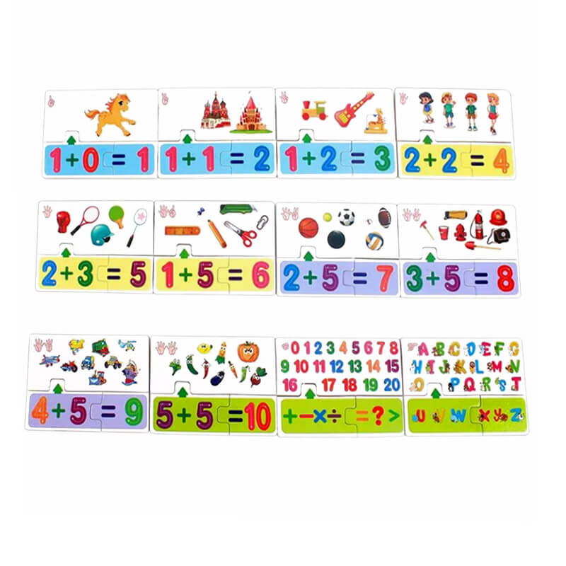 تحتوي البطاقات على عمليات حسابية بسيطة مدعومة برسومات توضيحية (مثل عدد الأشخاص أو الأشياء)، مما يساعد الطفل على فهم المفهوم العددي وربطه بالعدد المكتوب بطريقة عملية وبصرية.
